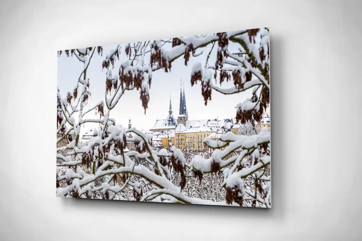 Luxembourg city under snow in winter rigid poster
