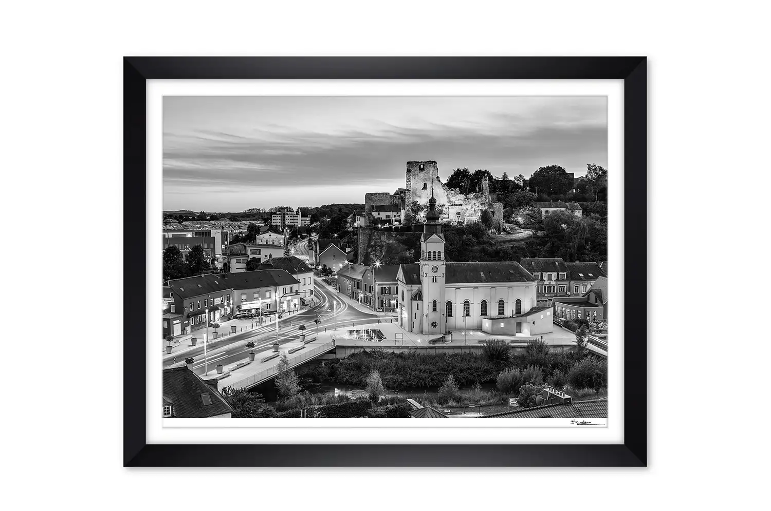 Hesperange castle and town at sunset print black and white