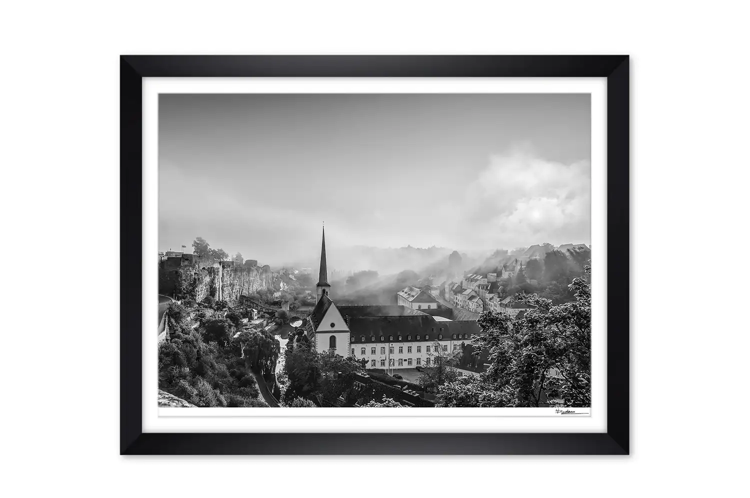 Luxembourg city grund during foggy summer morning print black and white