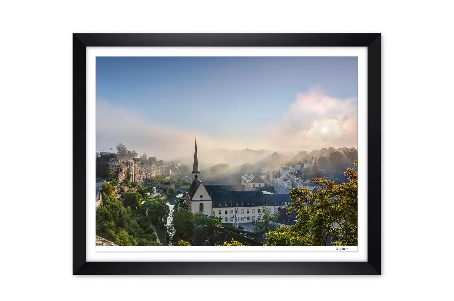 Luxembourg city grund during foggy summer morning print