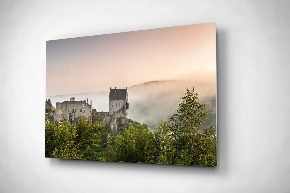 Foggy Larochette castle Luxembourg rigid poster