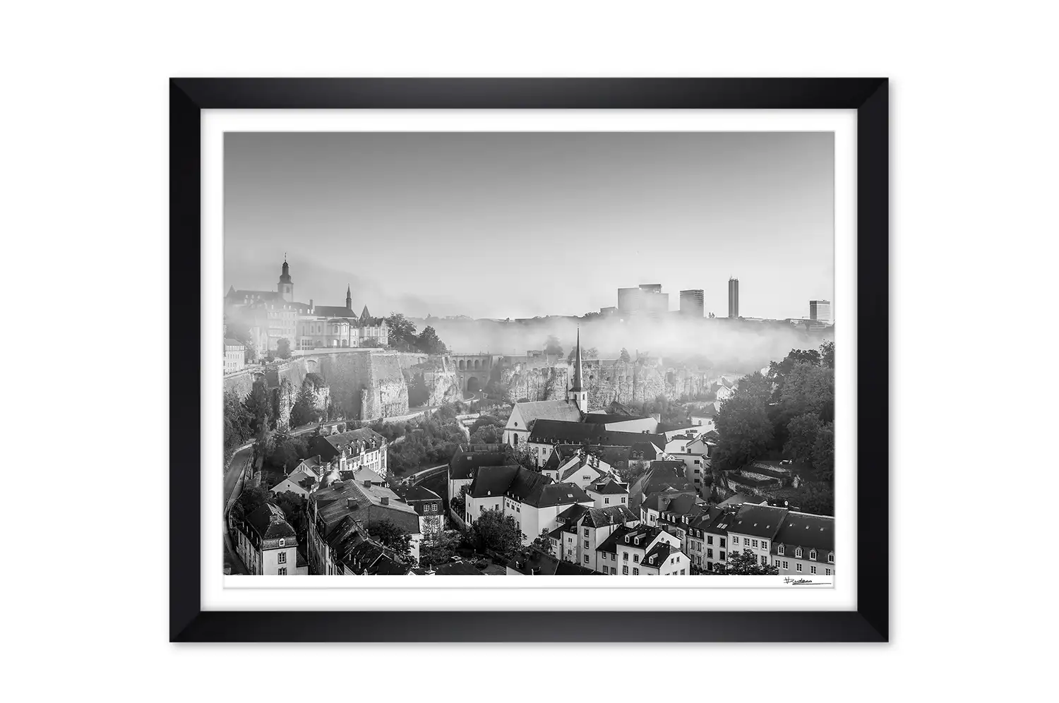 Luxembourg city skyline cityscape in fog print black and white