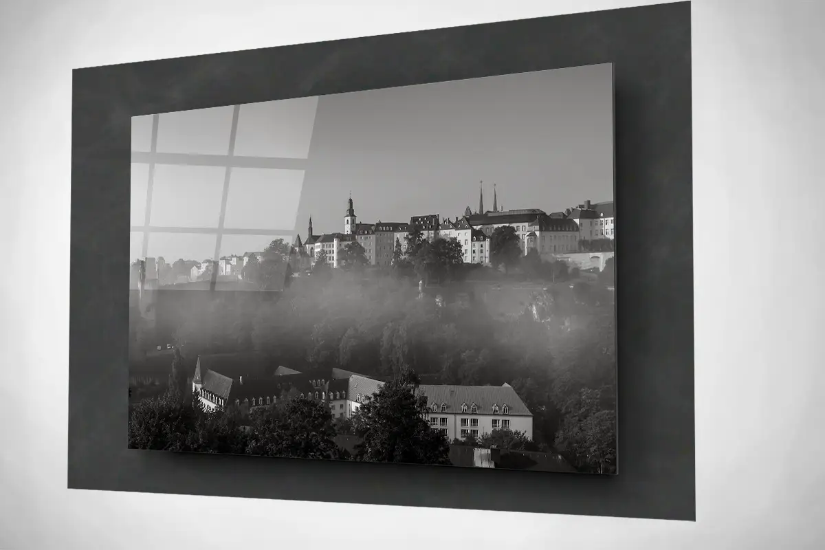 Luxembourg city foggy skyline floating acrylic black and white