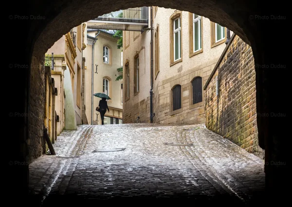 From: 50,00 €Frau auf der Straße in Luxemburg mit Regenschirm