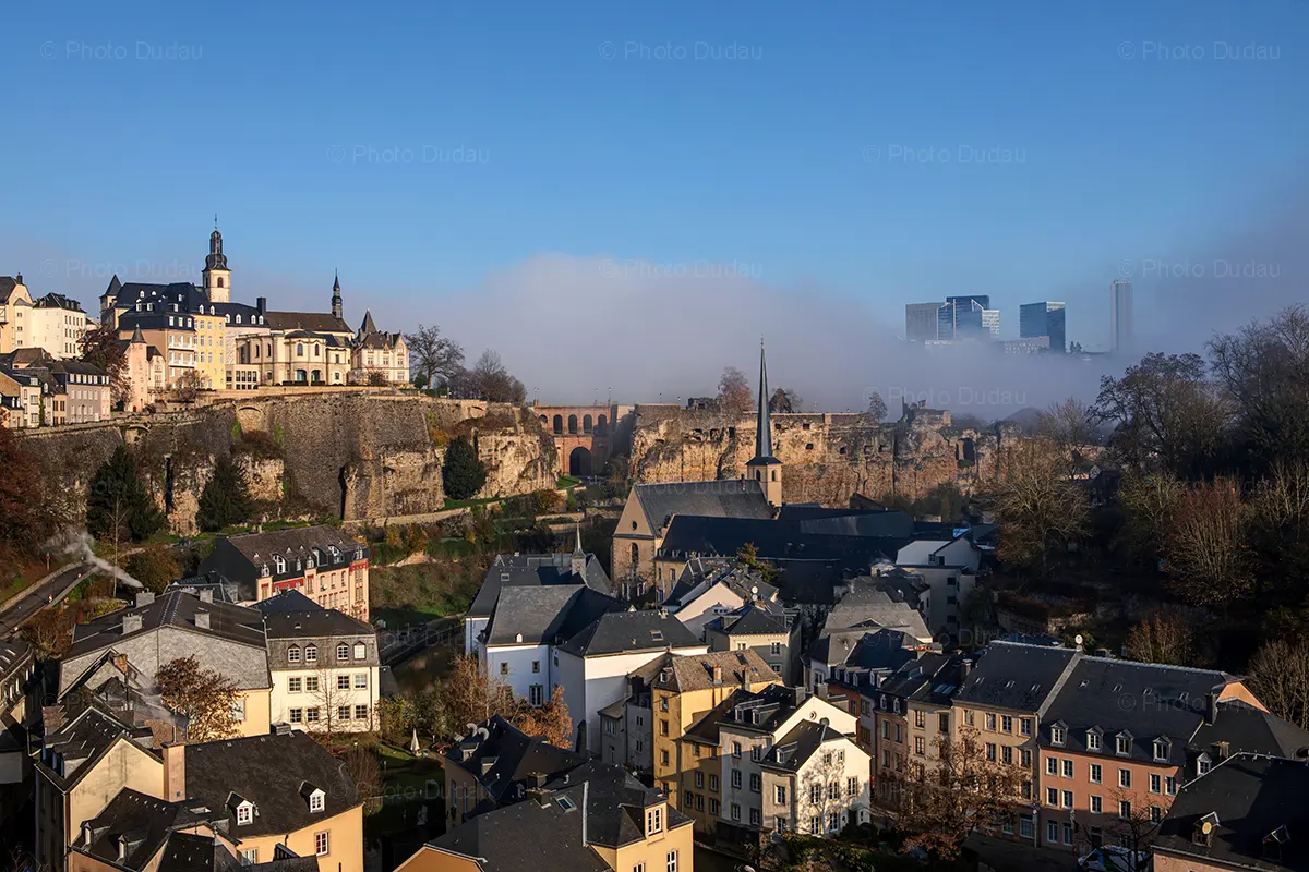 Kommerzielles Foto der Luxemburger Stadtsilhouette mit dem Grund mit der Abtei Neumünster, dem Chemin de la Corniche, der Kirche Saint-Michel, der Schlossbrücke, den Bockkasematten und dem Europaviertel Kirchberg an einem nebligen Herbstmorgen.
