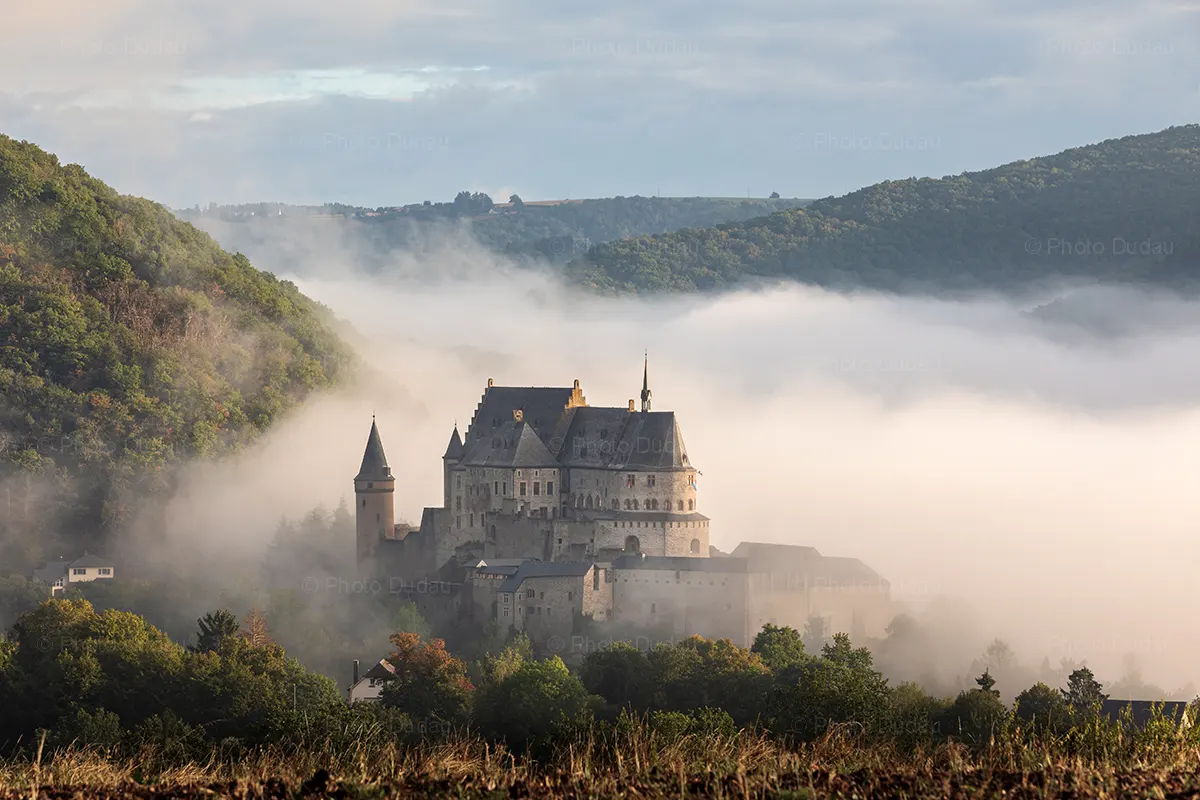 Werbefoto von Schloss Vianden in den luxemburgischen Ardennen an einem nebligen Morgen.