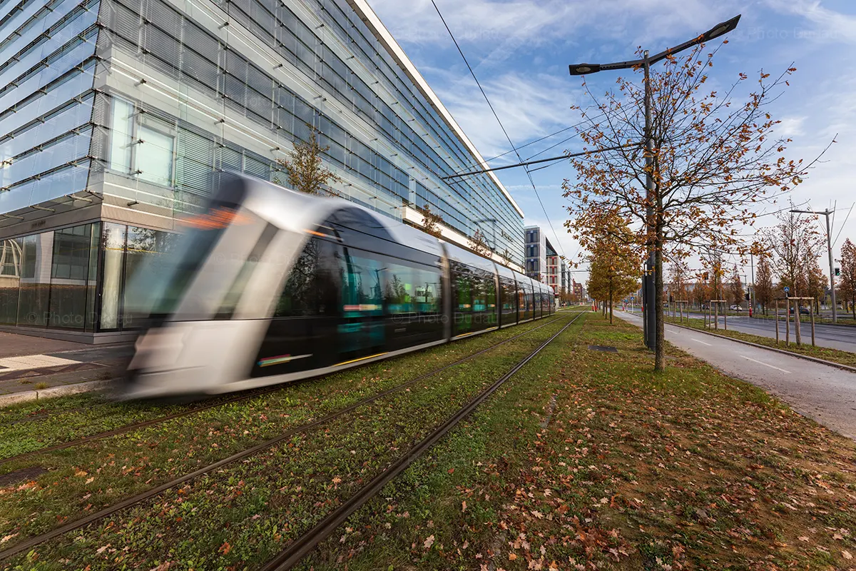 Photo commerciale d’un tramway rapide passant devant un immeuble de bureaux dans le quartier d’affaires Kirchberg, sur les nouvelles voies du tramway dans la ville de Luxembourg, de jour.