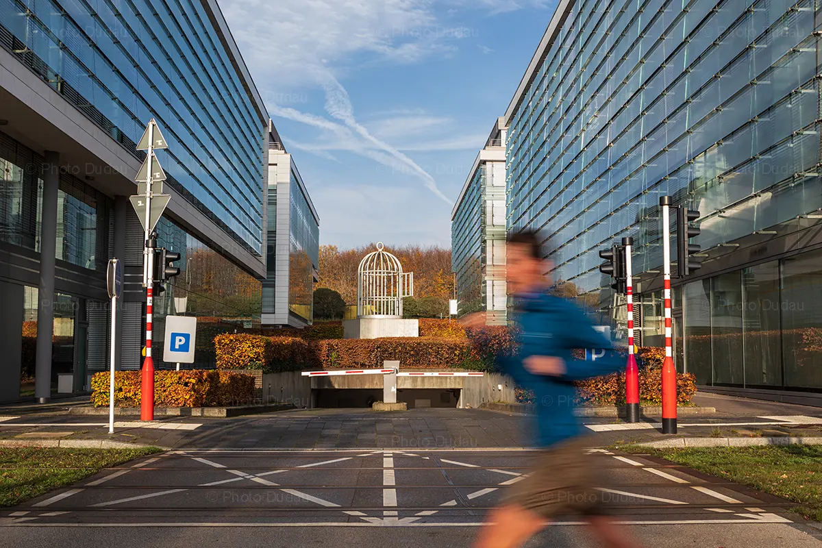 Commercial photo of business scene in European quarter Kirchberg, Luxembourg city: man running in front of modern glass and steel office buildings and Bird Cage sculpture.