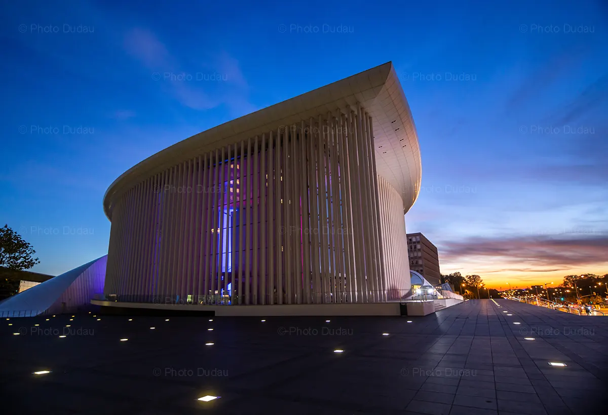 Commercial photo of The Grande-Duchesse Josรฉphine-Charlotte Concert Hall, or Luxembourg Philharmonie (Philharmonic) in Kirchberg, Luxembourg city during sunset.