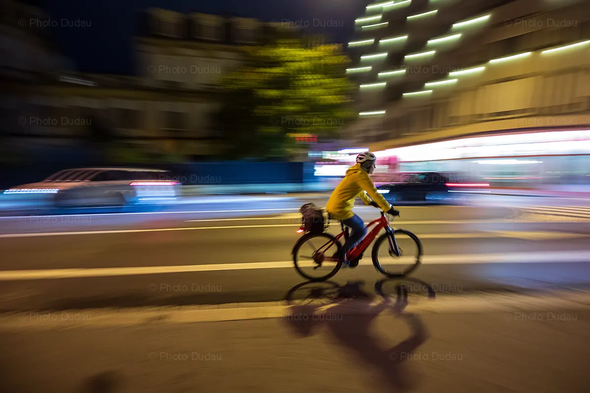 Editorial street photo of woman riding a bike downtown Luxembourg city at night โ panning effect.